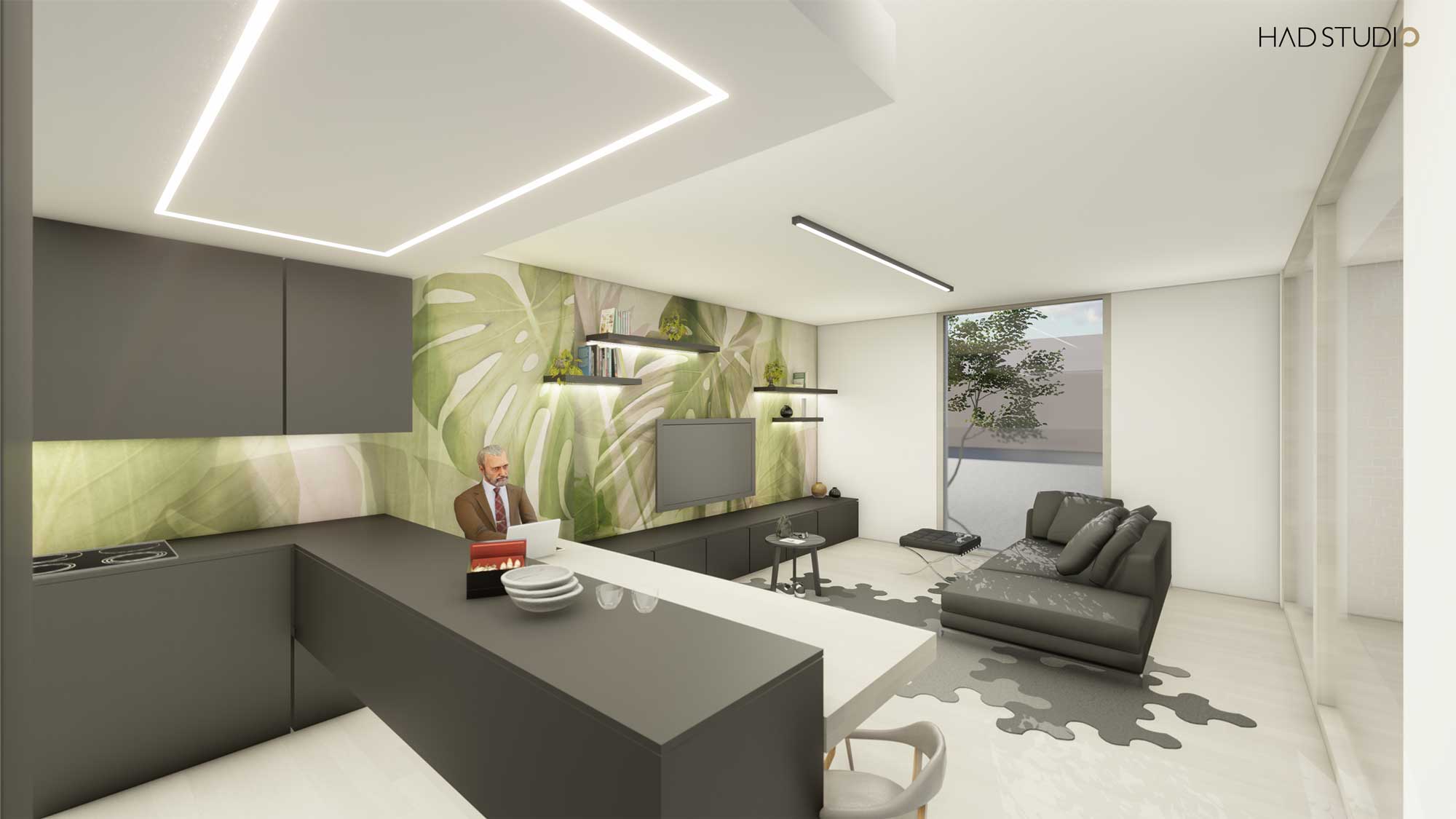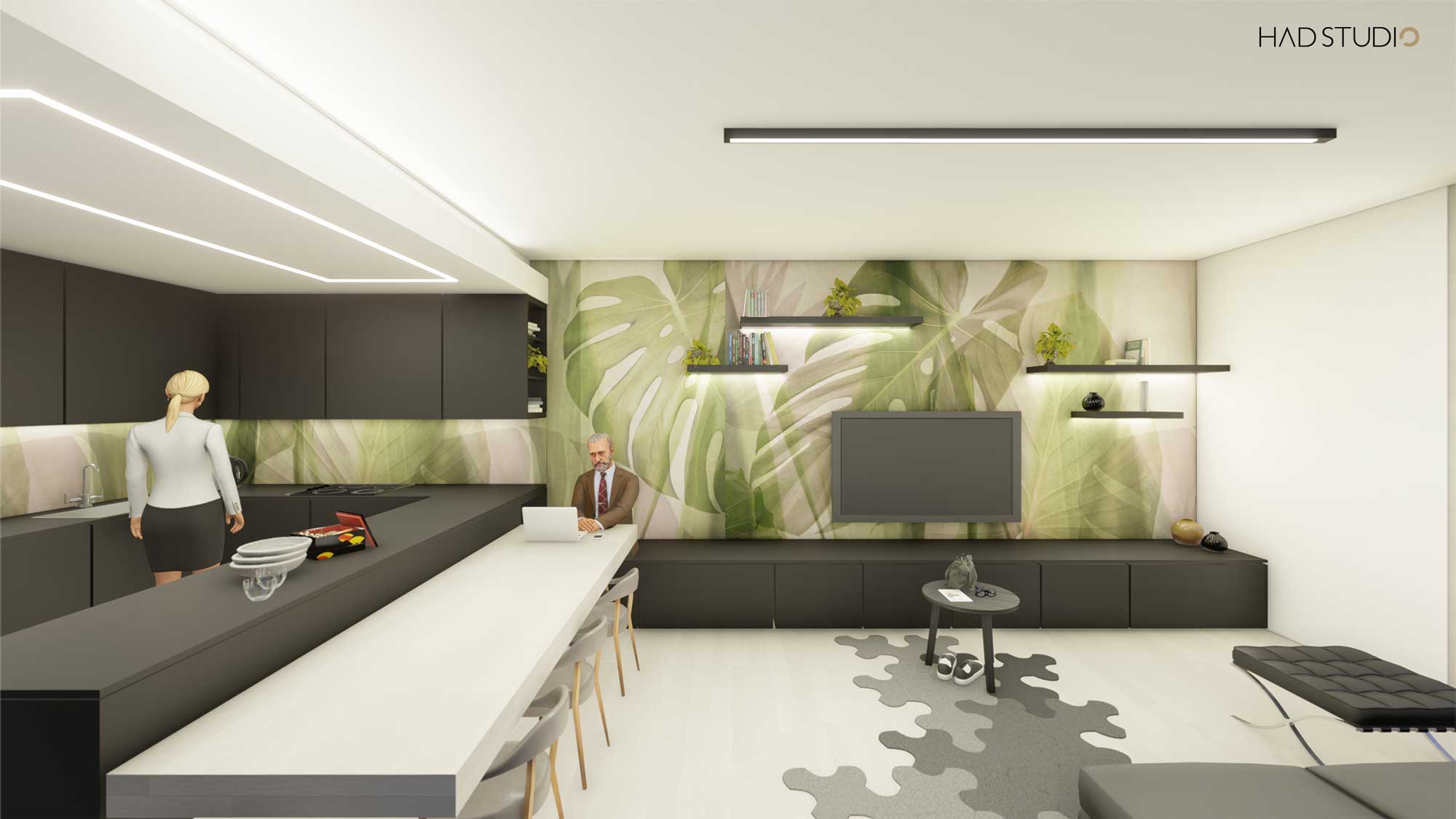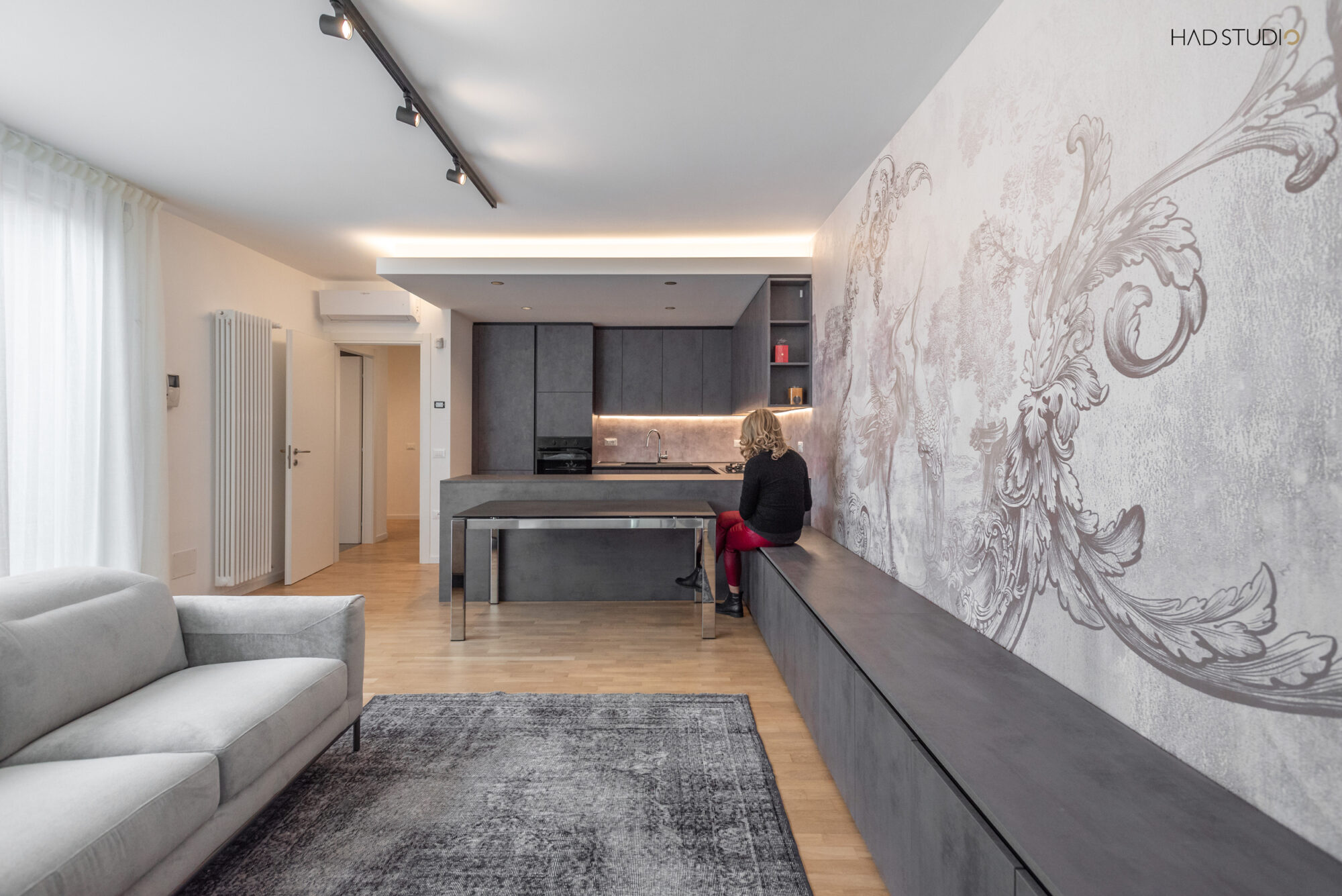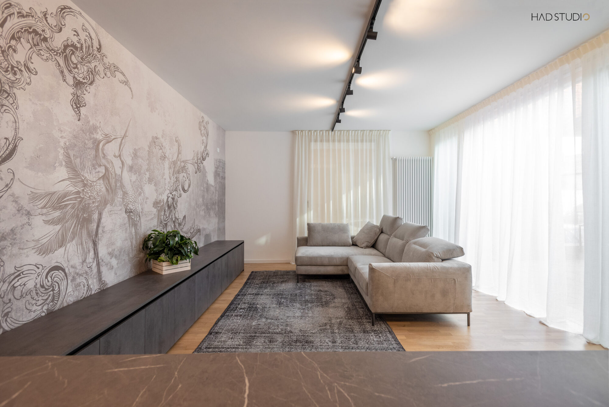 La zona living è caratterizzata da una carta da parati unica, anch’essa progettata per adattarsi al meglio all’ambiente, con l’obiettivo di creare un sfondo scenografico con affaccio sul patio. Lo scopo della progettazione è stato quello di generare delle ambientazioni originali, rispondendo alle esigenze funzionali ed estetiche della committenza, perciò in linea con la personalità sofisticata di chi andrà ad abitare questi spazi.