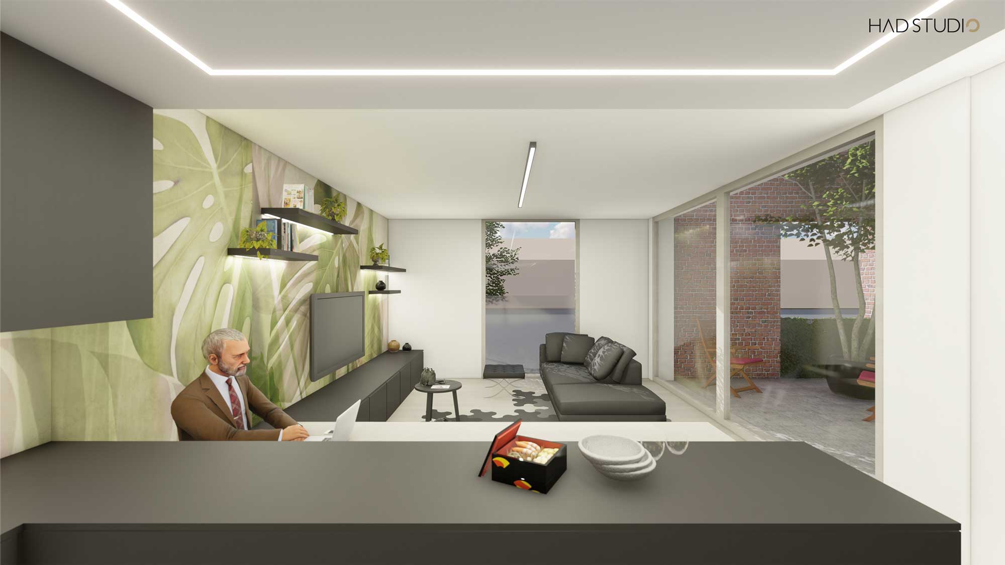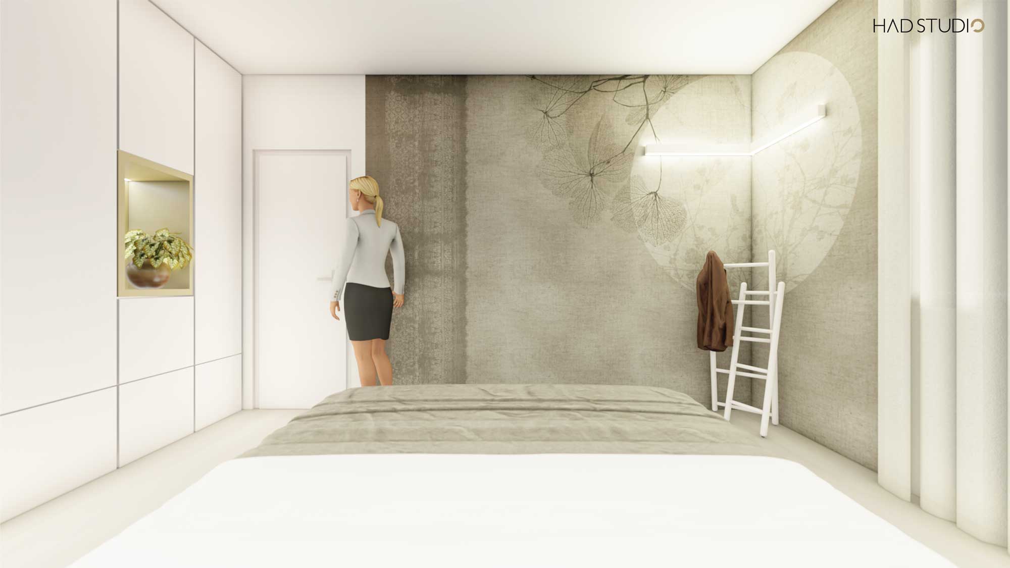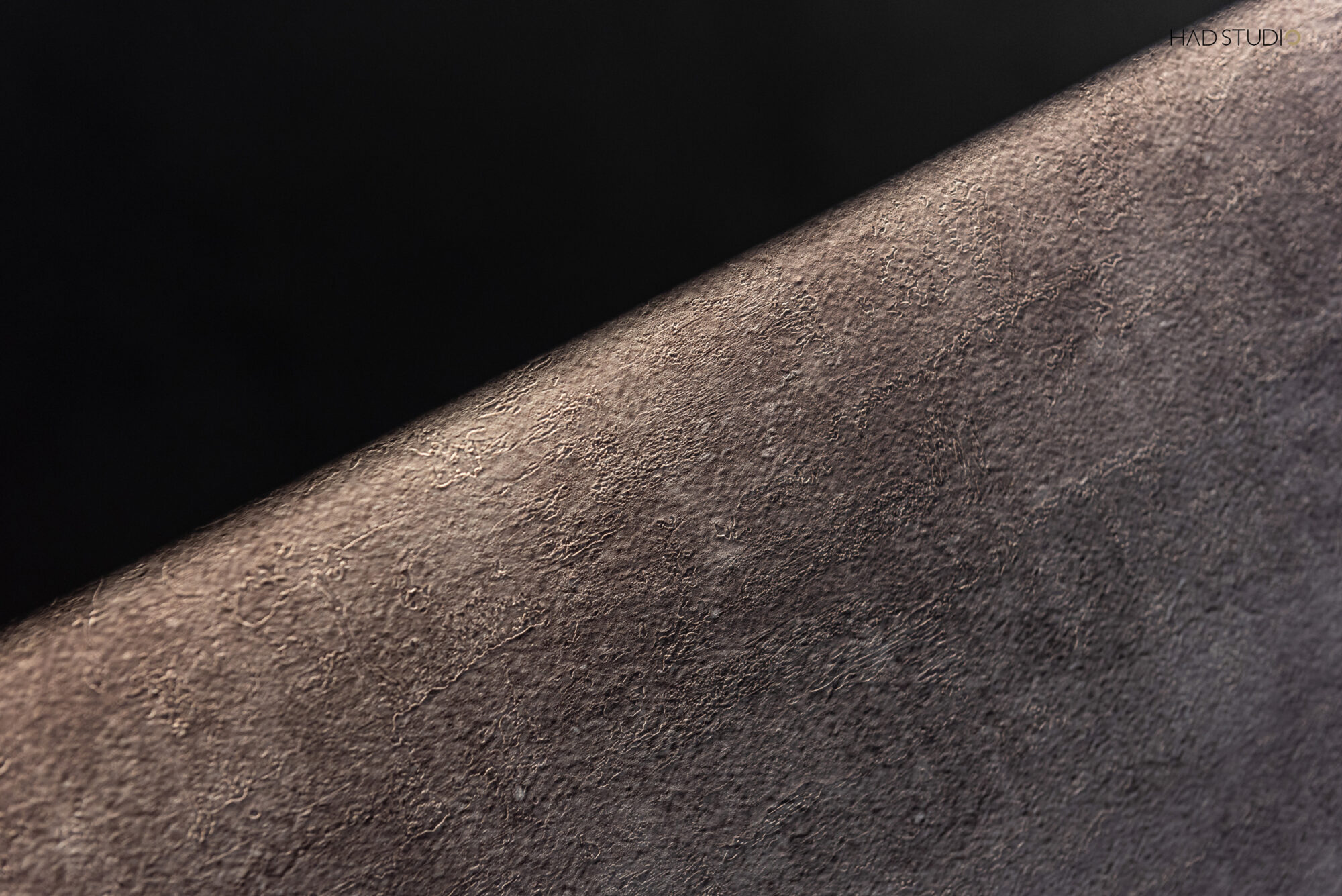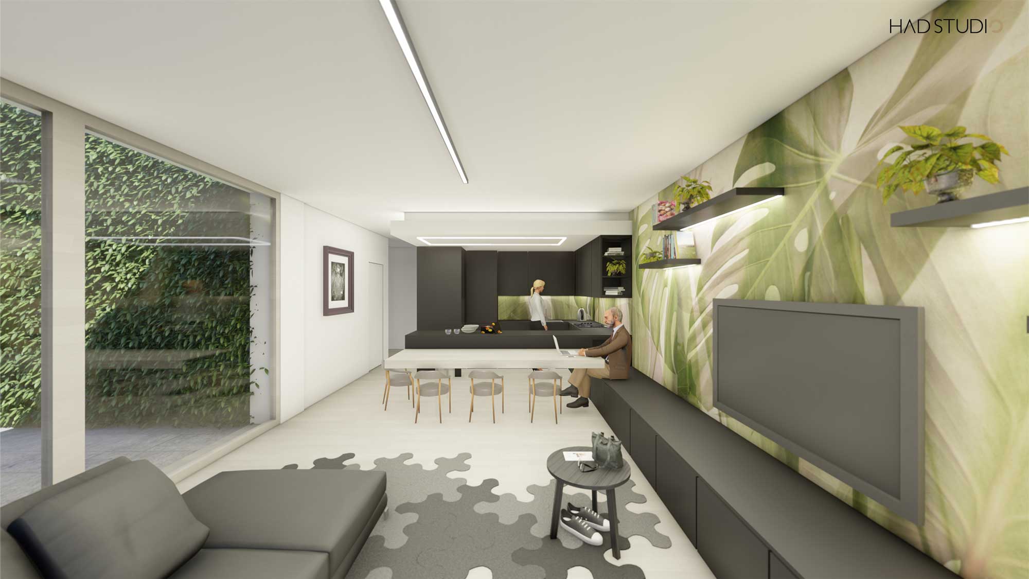 La zona living è caratterizzata da una carta da parati unica, anch’essa progettata per adattarsi al meglio all’ambiente, con l’obiettivo di creare un sfondo scenografico con affaccio sul patio. Lo scopo della progettazione è stato quello di generare delle ambientazioni originali, rispondendo alle esigenze funzionali ed estetiche della committenza, perciò in linea con la personalità sofisticata di chi andrà ad abitare questi spazi.