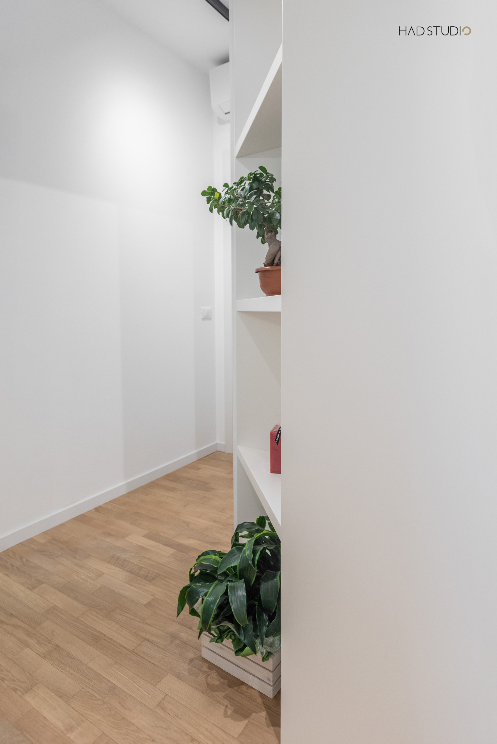 L’appartamento è composto prima di tutto da un ingresso semplice, attrezzato con un arredo disegnato e realizzato su misura. Successivamente, due camere, un bagno rivestito interamente in resina e un ampio open space, in cui trova posto la cucina, progettata con l’obiettivo di valorizzare la modularità dei sistemi tradizionali.