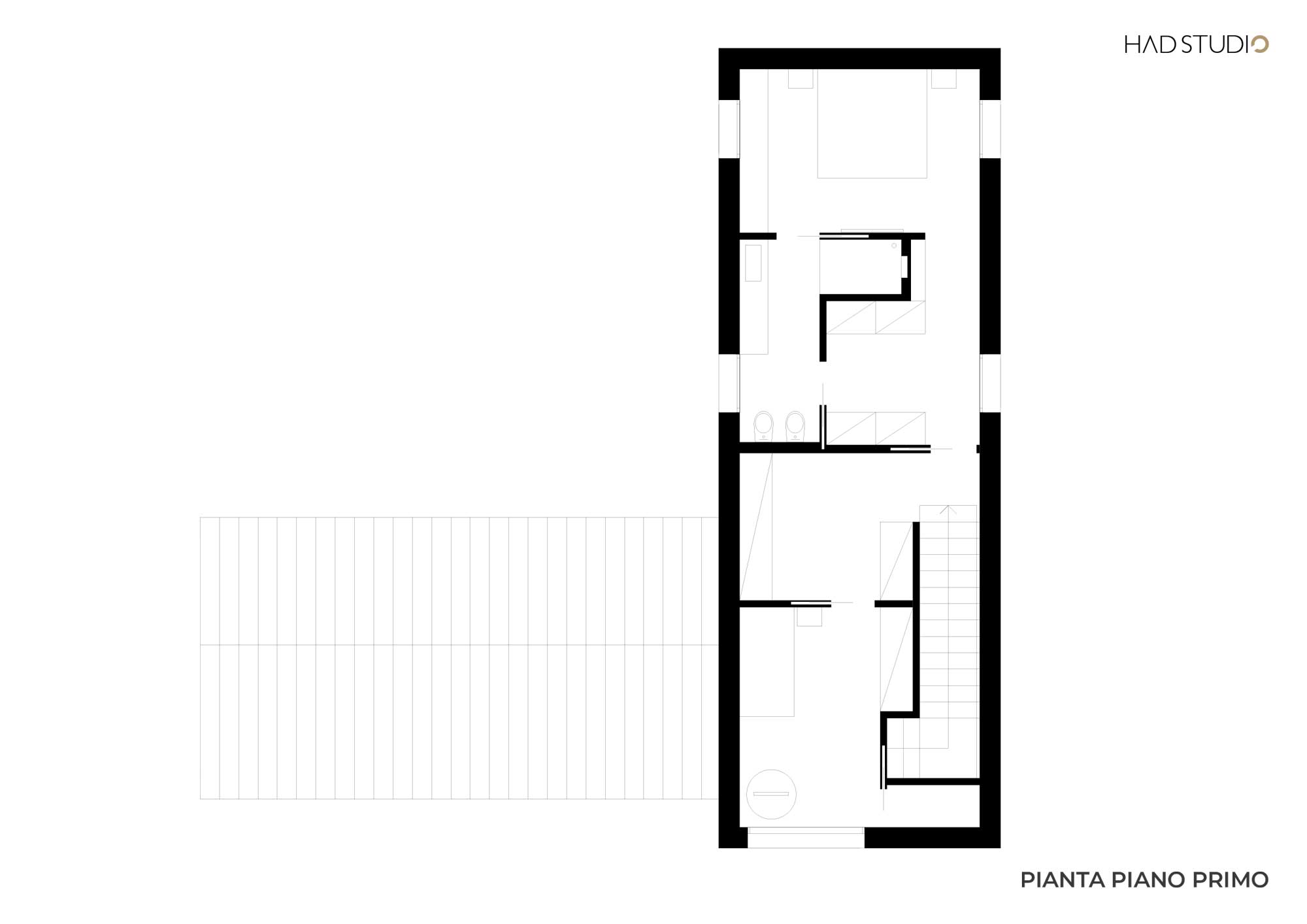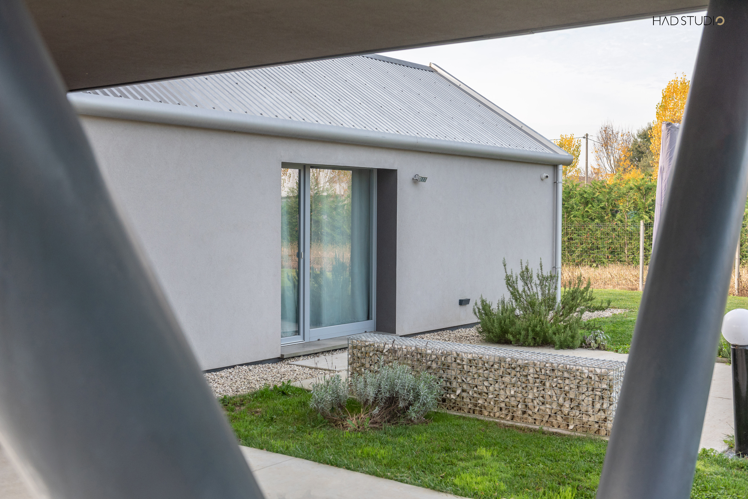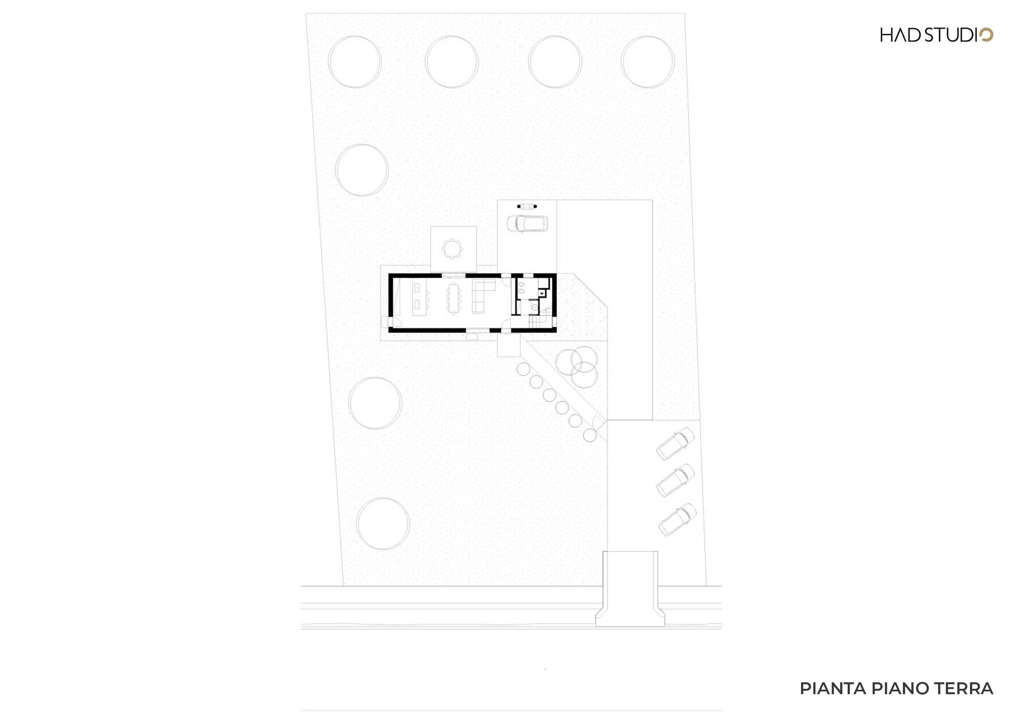 I due volumi sovrapposti identificano la zona giorno e la zona notte. La prima, chiusa nel fronte strada, è in diretta comunicazione con il giardino, che si trova sul retro, attraverso l’ampia vetrata. Qui si collocano l’open space e il bagno giorno. Salendo le scale si raggiunge la zona notte, in cui troviamo una successione di spazi scanditi da aperture regolari con affaccio sul verde circostante: due camere di cui quella padronale con cabina armadio, il bagno e un angolo studio. Questo volume sovrapposto, sorretto da un pilastro ad Y quale elemento volto ad esaltarne la sospensione, funge anche da copertura per uno spazio dalla duplice funzionalità: portico e all’occorrenza posto auto coperto.