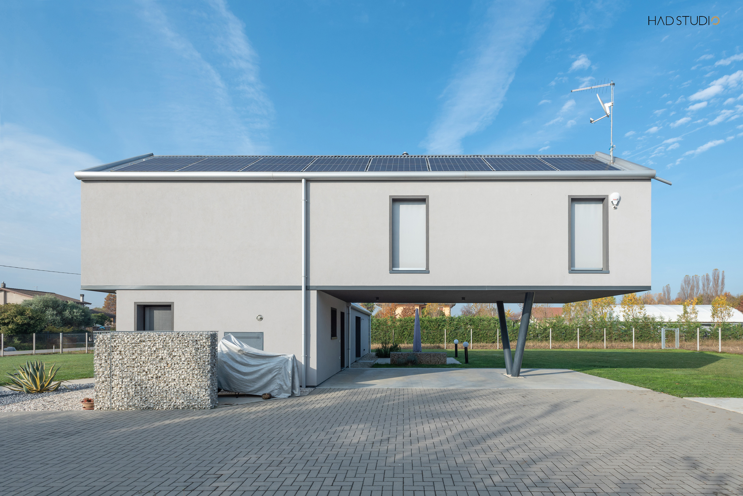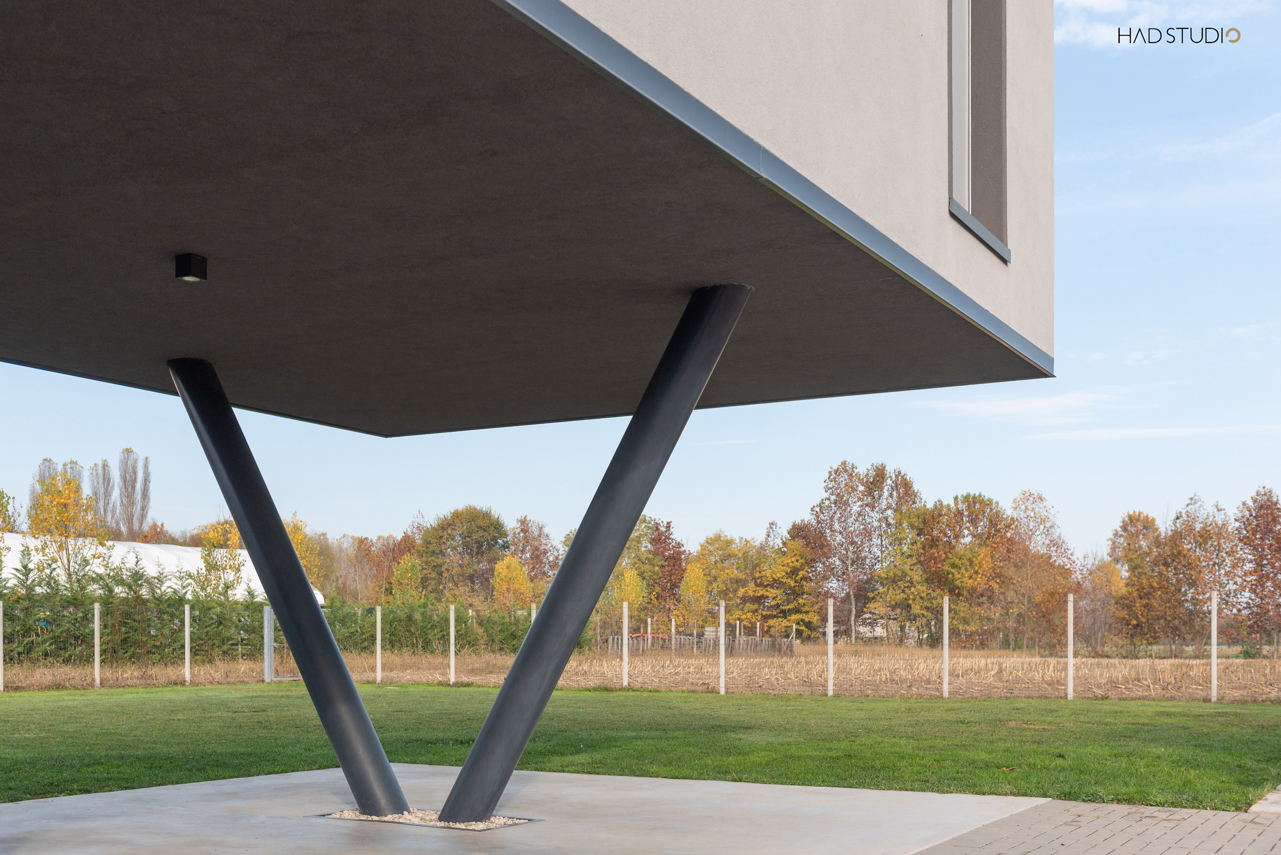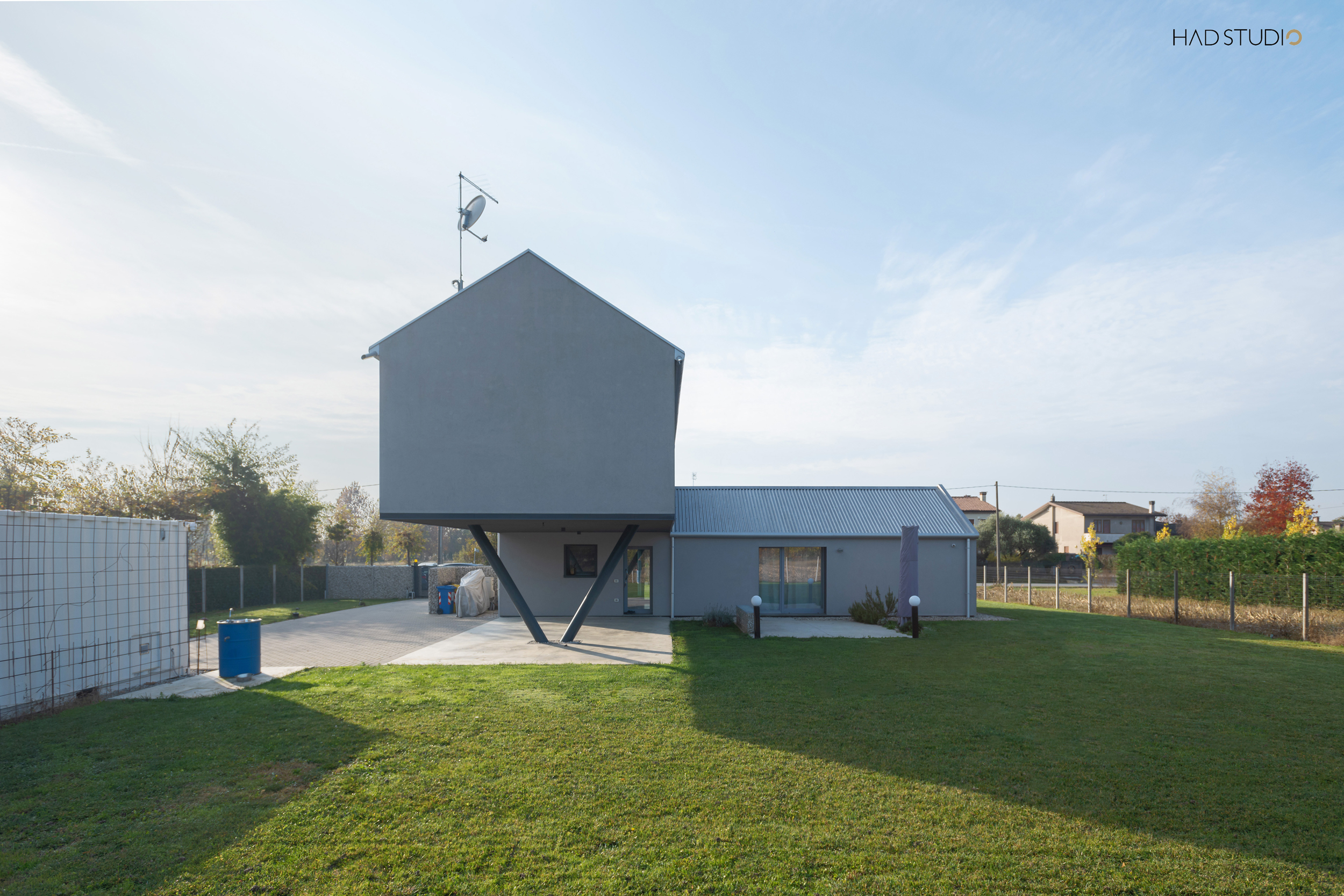 Sorretto da un pilastro ad Y, quale elemento volto ad esaltarne la sospensione, l’edificio è immerso nel contesto della Pianura Padana e ha come sfondo il Monte Grappa